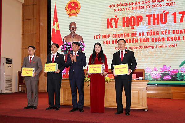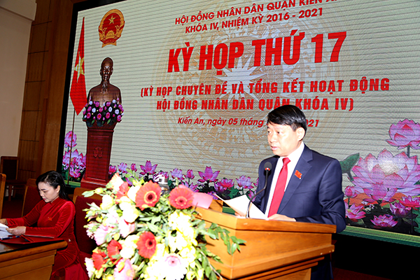 Phát biểu tại cuộc họp, đồng chí Phạm Văn Khanh, Bí thư quận ủy, Chủ tịch HĐND quận nhấn mạnh, sau 1/2 ngày làm việc tích cực, khẩn trương, kỳ họp thứ 17 HĐND quận Kiến An đã hoàn thành nội dung chương trình đề ra và thành công tốt đẹp. Kỳ họp đã tiến hành xem xét cho ý kiến và thông qua 04 Nghị quyết theo đúng trình tự quy định của pháp luật và tổng kết, đánh giá toàn diện tình hình tổ chức và hoạt động của HĐND quận khóa IV, nhiệm kỳ 2016-2021; biểu dương, động viên khen thưởng các tập thể và cá nhân có thành tích xuất sắc trong hoạt động của quận trong nhiệm kỳ qua. Kỳ họp thứ 17 là kỳ họp quan trọng liên quan đến việc kiện toàn chức danh Chủ tịch UBND quận nhiệm kỳ 2016-2021 và quyết định chủ trương đầu tư dự án công viên cây xanh tại phường Đồng Hòa, cho ý kiến dự kiến kế hoạch đầu tư công trung hạn giai đoạn 2021-2025 (lần 4) nhằm từng bước hoàn thiện cơ sở hạ tầng đô thị phục vụ hoạt động công ích, tạo khu vui chơi giải trí cho nhân dân; góp phần chỉnh trang đô thị, tạo động lực để thúc đẩy phát triển kinh tế-xã hội quận, thực hiện có hiệu quả Nghị quyết số 45-NQ/TW, ngày 24/01/2019 của Bộ Chính trị; tổng kết, đánh giá nhìn lại chặng đường hoạt động của HĐND quận khóa IV trong 5 năm qua.