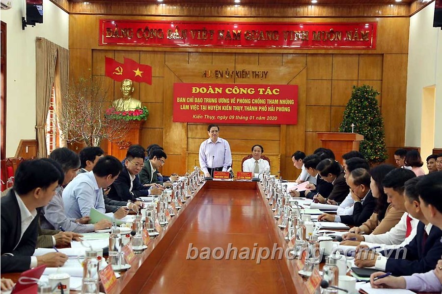 Sáng 9-1, Đoàn công tác Ban chỉ đạo trung ương về phòng, chống tham nhũng do đồng chí Phạm Minh Chính, Ủy viên Bộ Chính trị, Bí thư Trung ương Đảng, Trưởng Ban Tổ chức Trung ương làm trưởng đoàn làm việc tại huyện Kiến Thụy về công tác phòng, chống tham nhũng năm 2019; việc triển khai một số nghị quyết của trung ương về xây dựng chỉnh đốn Đảng; thực hiện Chỉ thị 05 của Bộ Chính trị gắn với thực hiện trách nhiệm nêu gương; thực hiện Chỉ thị số 05 của Bộ Chính trị về Đại hội Đảng các cấp, tiến tới Đại hội đại biểu toàn quốc lần thứ 13 của Đảng.