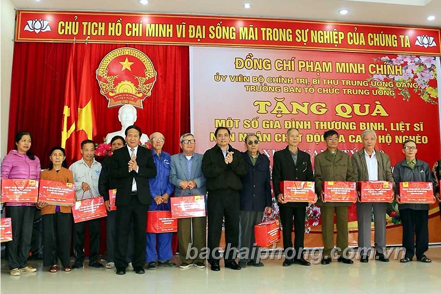 Nhân dịp này, đồng chí Phạm Minh Chính tặng quà 120 gia đình chính sách, hộ nghèo, nạn nhân chất độc da cam trên địa bàn huyện Kiến Thụy.