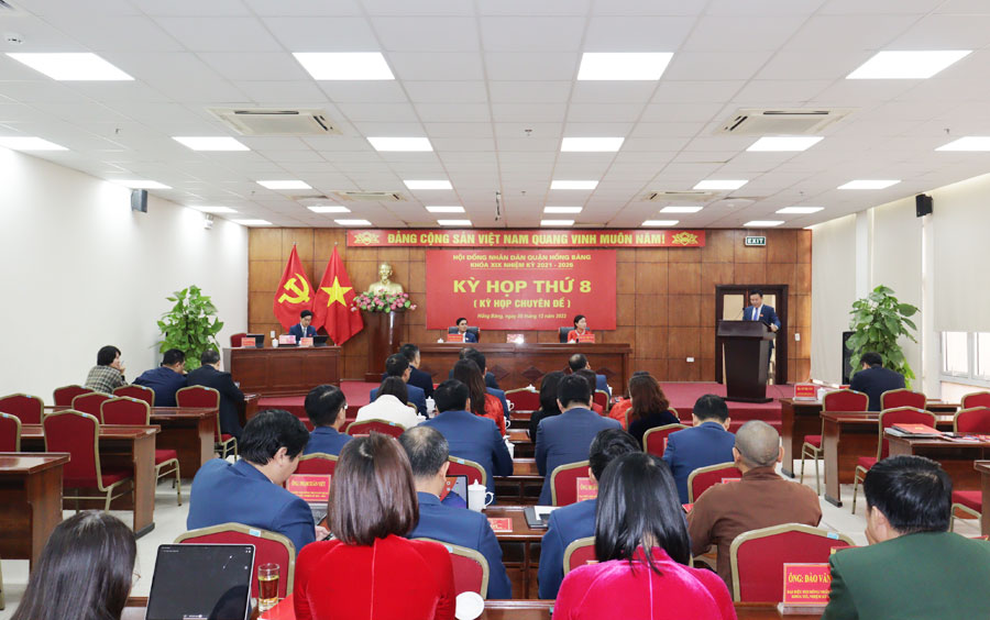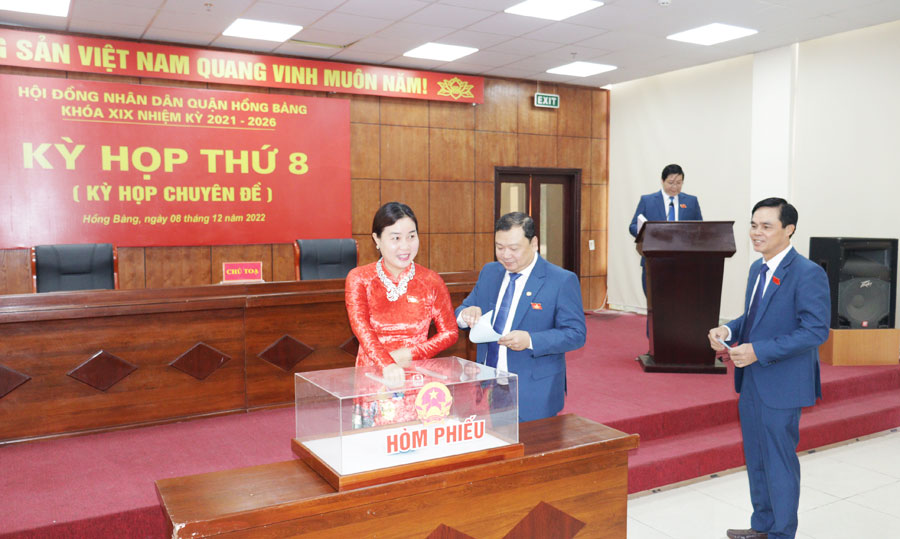 Sáng 8/12, HĐND quận Hồng Bàng tổ chức kỳ họp thứ 8 (kỳ họp chuyên đề) HĐND quận khoá XIX, nhiệm kỳ 2021-2026 tiến hành công tác nhân sự thuộc thẩm quyền của HĐND quận. Dự kỳ họp có lãnh đạo Sở Nội vụ, Văn phòng UBND thành phố.