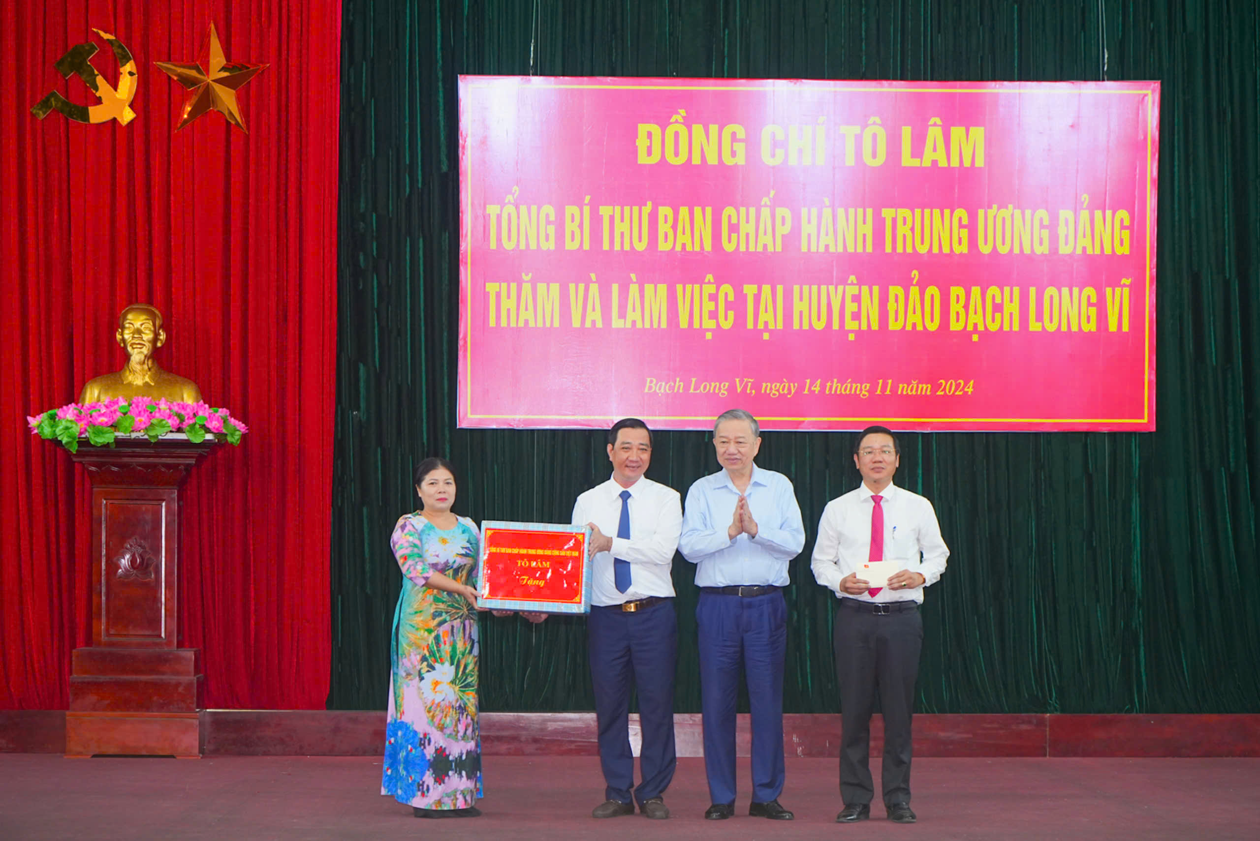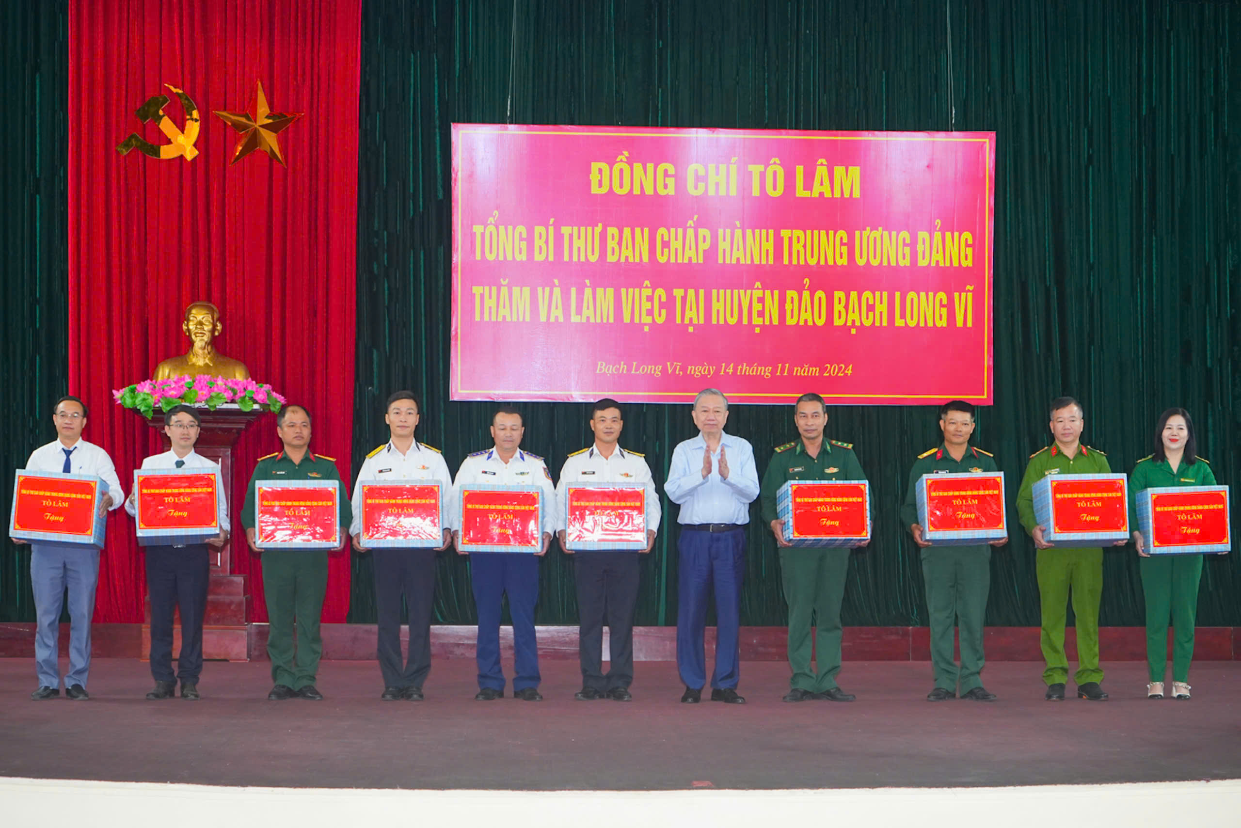 Nhân dịp này, đồng chí Tổng Bí thư Tô Lâm tặng quà Đảng bộ, chính quyền huyện Bạch Long Vĩ; lực lượng vũ trang và các cơ quan, đơn vị tiêu biểu trên địa bàn huyện đảo và trao 10 suất quà tặng 10 hộ dân là các gia đình chính sách và gia đình tiêu biểu.