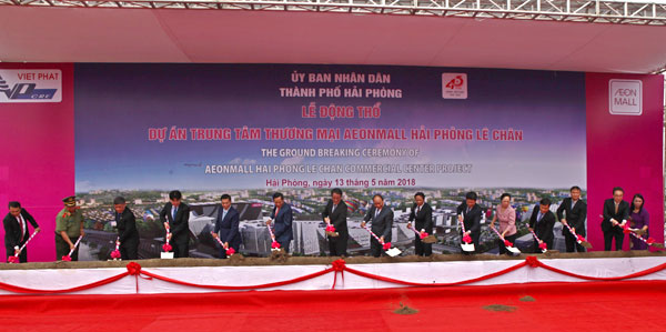 Sáng 13/5, UBND thành phố Hải Phòng, AEONMALL Việt Nam và Công ty CP Xây dựng bất động sản Việt Phát (đối tác phát triển hạ tầng thành phần) phối hợp tổ chức Lễ động thổ dự án “Trung tâm thương mại AEONMALL Hải Phòng Lê Chân”. Dự Lễ động thổ có các đồng chí: Nguyễn Xuân Phúc, Ủy viên Bộ Chính trị, Thủ tướng Chính phủ; Thuận Hữu, Ủy viên Trung ương Đảng, Tổng biên tập Báo Nhân dân; Đại sứ Nhật Bản tại Việt Nam Umeda Kunio và lãnh đạo các bộ, ban, ngành Trung ương.