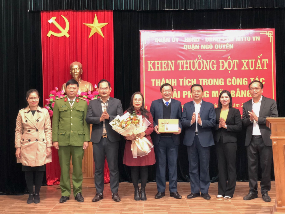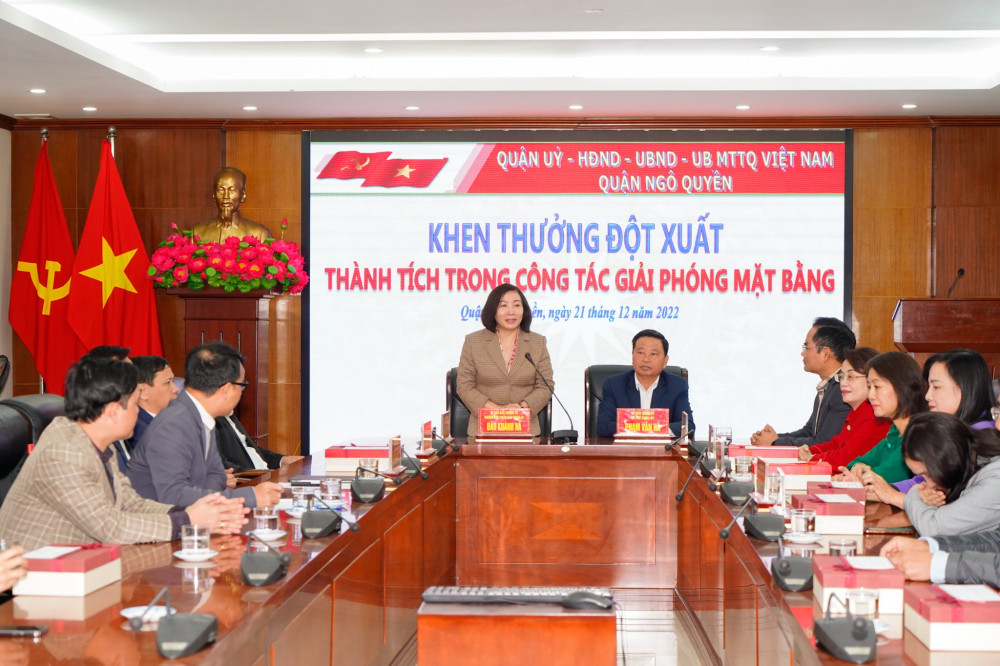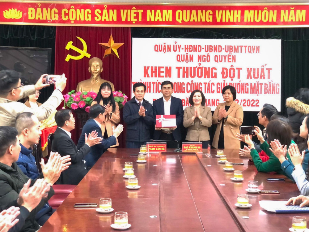 Để kịp thời động viên các tập thể đã hoàn thành xuất sắc nhiệm vụ được giao, sáng 21/12, đồng chí Đào Khánh Hà, Ủy viên Ban Thường vụ, Trưởng Ban Tuyên giáo Thành ủy cùng các đồng chí Thường trực Quận ủy Ngô Quyền đã đến gặp gỡ và khen thưởng nóng đối với Công an quận Ngô Quyền; Công an các phường Lạch Tray và Đằng Giang; các Tổ công tác, các phòng và đơn vị liên quan có thành tích trong công tác GPMB phục vụ Dự án chỉnh trang đô thị của thành phố.