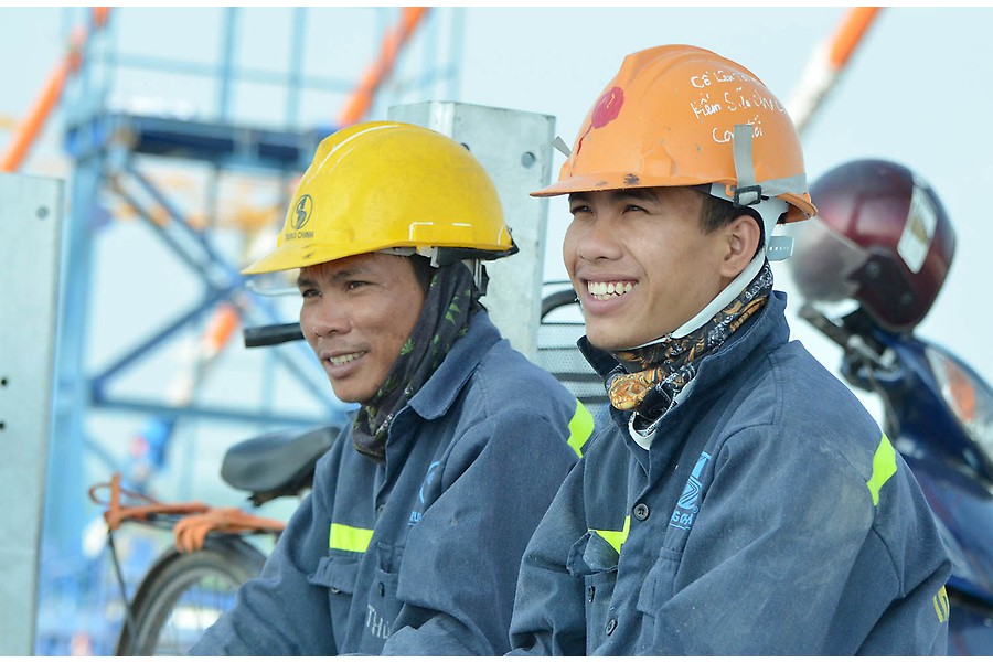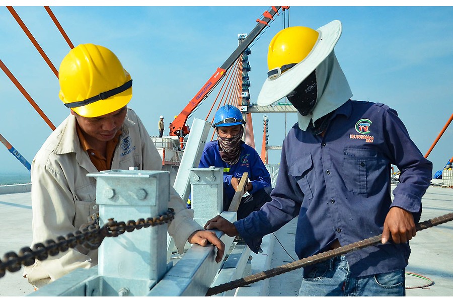 Công nhân Võ Hữu Như (bên phải, quê Nghệ An) lần đầu được tham gia thi công một cây cầu lớn.