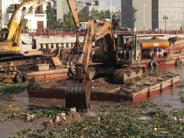 Chủ đầu tư và các nhà thầu đang đẩy mạnh thi công những phần việc cuối cùng, trong đó có việc nạo vét lòng sông