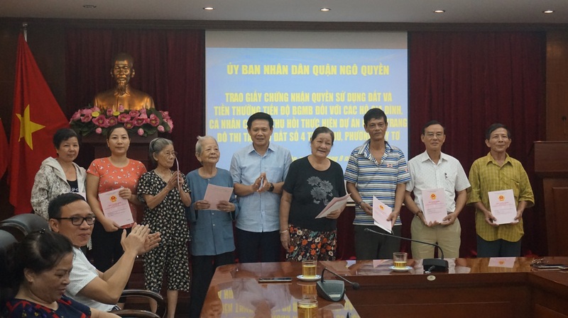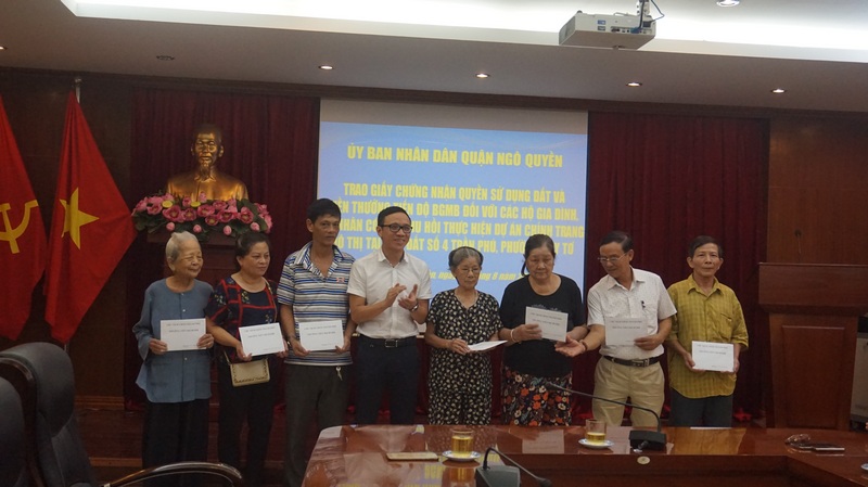 Sáng 16-8, UBND quận Ngô Quyền tổ chức trao giấy chứng nhân quyền sử dụng đất và tiền thưởng tiến độ bàn giao mặt bằng của Chủ tịch UBND thành phố cho các hộ gia đình, cá nhân có đất thu hồi thực hiện dự án Đầu tư chỉnh trang đô thị và phục vụ đấu giá đất tại khu đất số 4 phố Trần Phú, phường Máy Tơ.