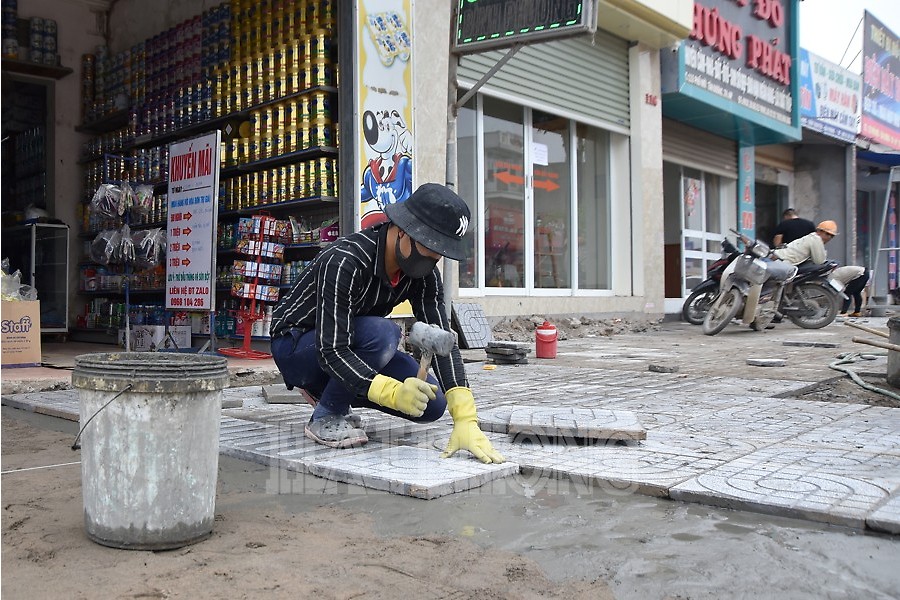 Công nhân thi công hoàn trả vỉa hè và các công trình phụ trợ.