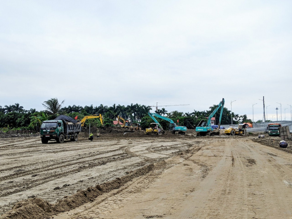 Về công tác thi công, trong phạm vi mặt bằng được bàn giao, hiện các nhà thầu đã tích cực triển khai công tác thi công, đến nay đã thực hiện một số khối lượng công việc chính như: phát quang mặt bằng được 36.500m²; đào bóc hữu cơ nền đường 48.200m³ ; đắp nền 38.000m³; khoan cọc xi măng đất được 1.962/2.083 cọc; hoàn thành thi công 02 đốt cống L=45,6m và đang thi công 02 đốt cống tiếp theo; hoàn thành việc lắp dựng 2 trụ tạm cột đôi ly tâm L20 và kéo lắp đường dây phục vụ di chuyển đường điện 110kV…