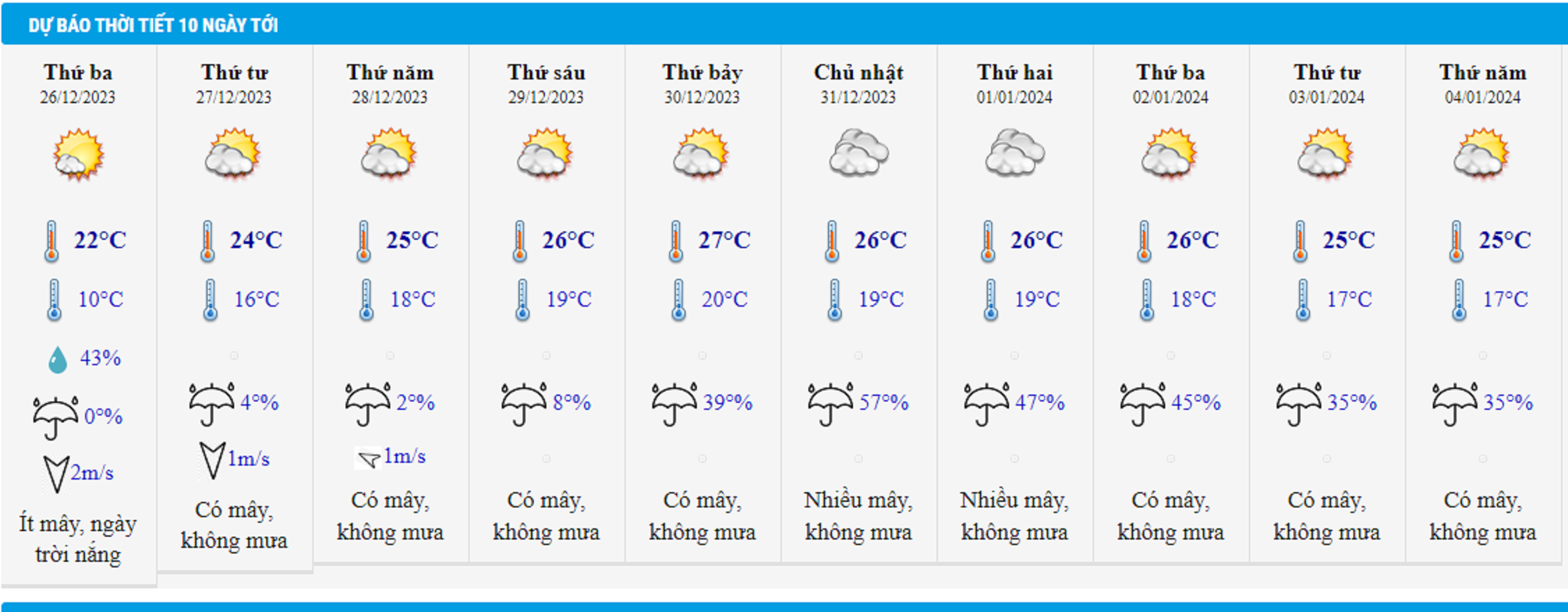 10 ngày tới, Hà Nội không mưa, nhiều ngày có nắng. Nền nhiệt có xu hướng tăng đều, nhiều ngày nhiệt độ cao nhất 26-27 độ C, nhiệt độ thấp nhất cũng nhích lên 18-19 độ C.