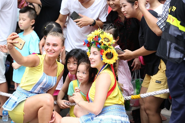 Người dân, trong đó có rất nhiều du khách nước ngoài đã đứng chật cứng hai bên đường, ai cũng háo hức và sẵn sàng giơ máy ảnh, điện thoại để ghi lại những hình ảnh đẹp nhất. Người già, trẻ nhỏ… nhún nhảy theo từng giai điệu sôi động của vũ công.