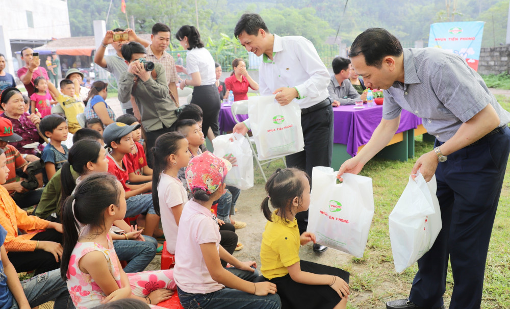 Ông Nguyễn Văn Thức, Phó Tổng giám đốc Nhựa Tiền Phong tặng quà các em thiếu nhi điểm trường mầm non, tiểu học thôn Thượng xã Bằng Lang, huyện Quang Bình, tỉnh Hà Giang