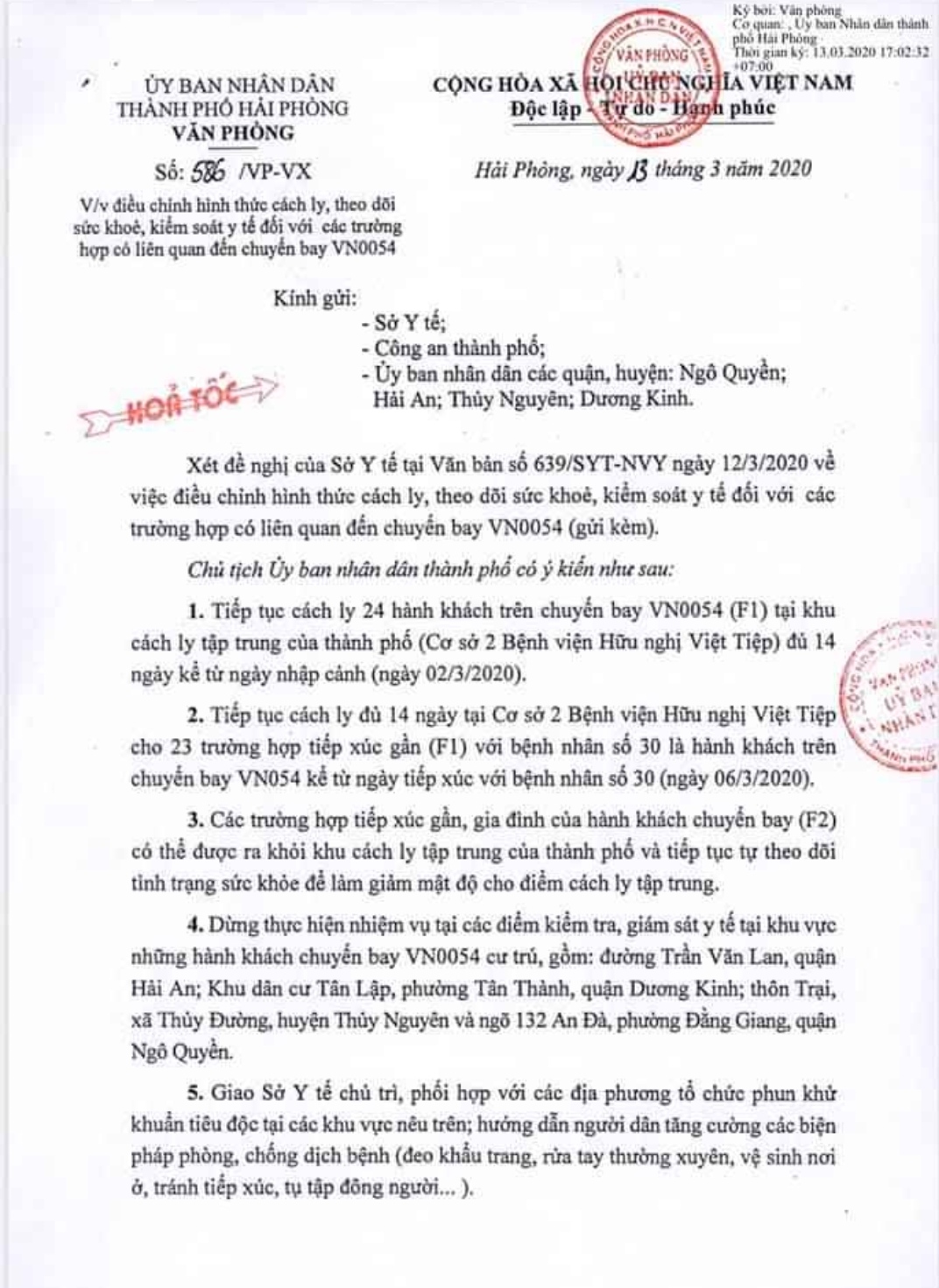 Đồng thời, tiếp tục cách ly 24 hành khách trên chuyến bay VN 0054 (F1) tại khu cách ly tập trung của thành phố là Bệnh viện Việt Tiệp cơ sở 2 cho đủ 14 ngày kể từ ngày nhập cảnh (02/3/2020).