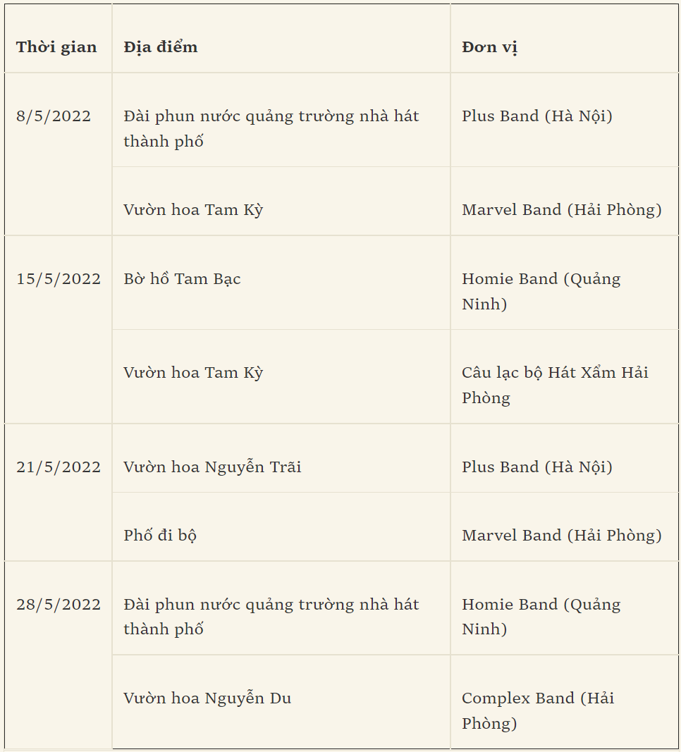 Chào mừng kỷ niệm 67 năm ngày Giải phóng Hải Phòng và hưởng ứng Lễ hội Hoa Phượng Đỏ-Hải Phòng 2022, Trung tâm Văn hóa thành phố tổ chức Festival âm nhạc đường phố vào 20h00 ngày cuối tuần tại nhiều địa điểm quanh dải trung tâm thành phố.