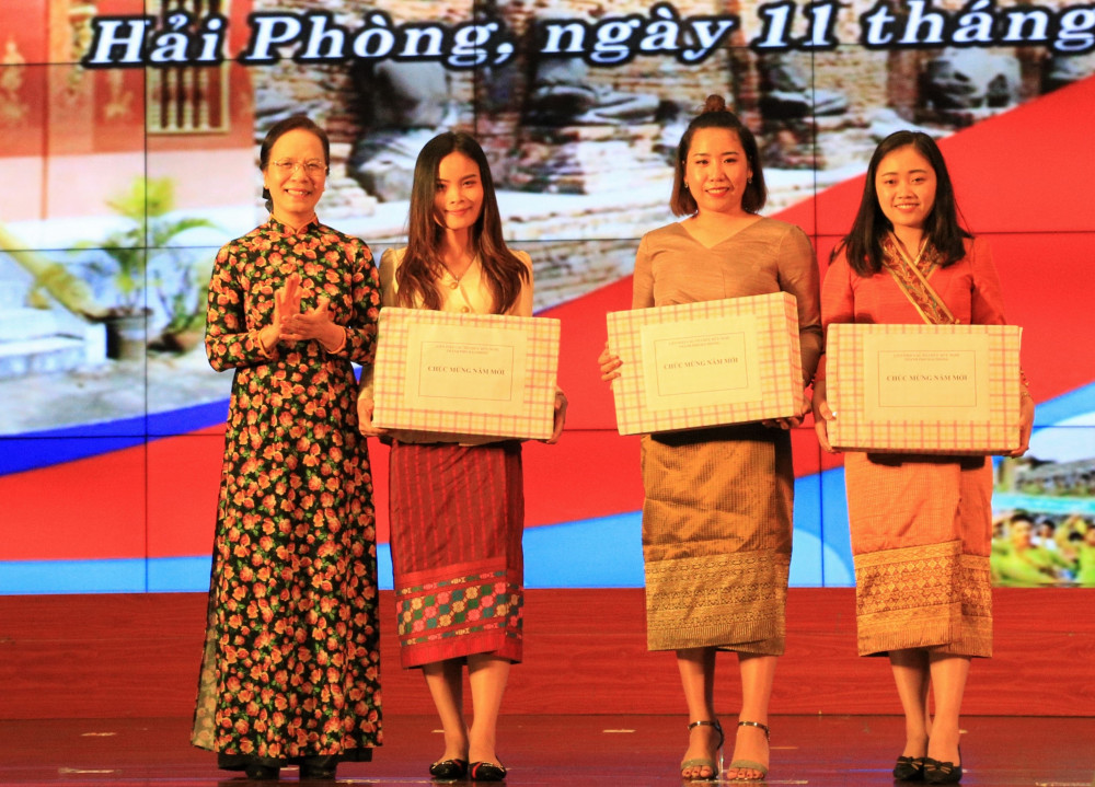 Đồng chí Nguyễn Thị Nghĩa – Phó Bí Thường trực Thành uỷ, Trưởng đoàn đại biểu Quốc hội Hải Phòng, Chủ tịch Liên hiệp Các tổ chức hữu nghị thành phố tặng quà cho sinh viên các nước Lào, Myanmar, Thái Lan đang học tập tại Hải Phòng