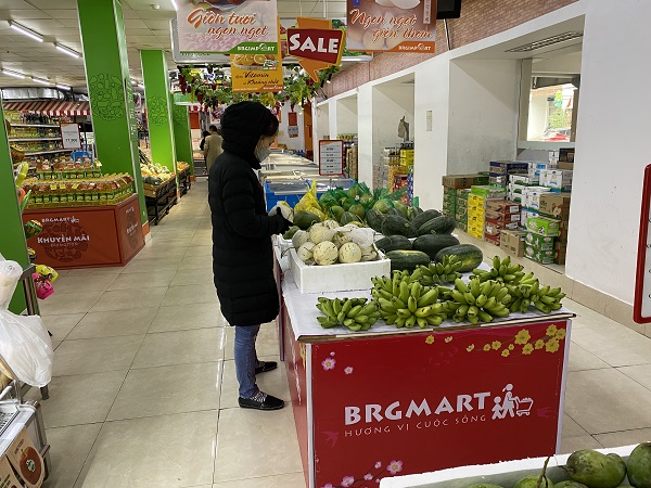 Đơn cử như tại siêu thị BRG Mart, giá thịt lợn ngày 10/2, thịt ba chỉ ở mức 142.000 đồng/kg, thịt nạc vai ở mức 141.000 đồng/kg, sườn non ở mức 164.000 đồng/kg; các loại rau củ như cà rốt có giá 27.000 đồng/kg; dưa chuột có giá 23.500 đồng/kg; cà tím dài có giá 18.500 đồng/kg; bí đỏ dài có giá 15.600 đồng/kg, quả bầu và bí xanh có giá 22.500 đồng/kg;… cơ bản không thay đổi nhiều so với cao điểm mua sắm Tết.
