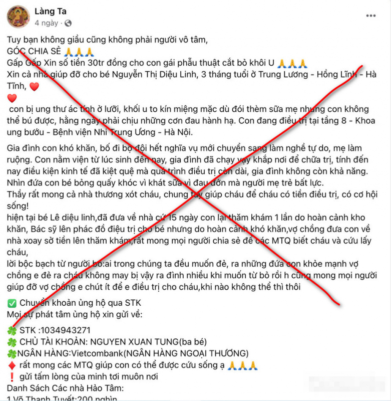 Trên fanpage “Làng Ta” cũng chủ tài khoản NGUYEN XUAN TUNG kêu gọi quyên góp cho một bệnh nhi khác mà chủ tài khoản cũng là “ba bé“: “Gấp Gấp Xin số tiền 30tr đồng cho con gái cắt bỏ khôi U. Xin cả nhà giúp đỡ cho bé Nguyễn Thị Diệu Linh, 3 tháng tuổi ở Trung Lương – Hồng Lĩnh – Hà Tĩnh…”.