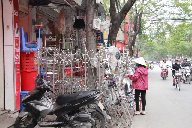 Các hộ dân kinh doanh bày bán hàng hóa xuống tận lòng đường, trên đường Điện Biên Phủ khu vực đầu ngã 6.