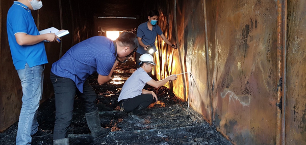 Sau khi nắm sơ bộ các thông tin ban đầu, từ những dấu vết đặc trưng, các giám định viên đã xác định được vùng cháy đầu tiên nằm trong diện 40m². Nhờ sự hỗ trợ của 2 máy công trình làm nhiệm vụ xúc, gạt giải phóng mặt bằng vùng cháy trên, công đoạn khám nghiệm mới được tiến hành. Thời tiết hết mưa chuyển sang nắng gắt. Trong bầu không khí hết sức khó chịu đó, tổ công tác vẫn nỗ lực không ngừng làm việc tỉ mỉ, thận trọng suốt 6 tiếng đồng hồ, cuối cùng cũng chỉ ra được những vị trí nghi vấn, thu mẫu để phục vụ công tác giám định. Kết quả quá trình làm việc khẩn trương đó đã giúp Cơ quan điều tra có căn cứ để xử lý vụ việc, ổn định tình hình dư luận khu dân cư cũng như giúp công ty khắc phục hậu quả, sớm ổn định sản xuất.