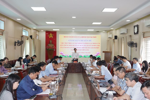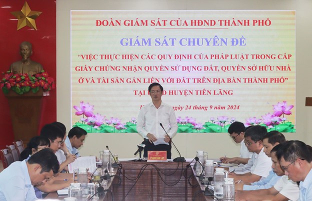 Sáng 24/9, Đoàn giám sát chuyên đề của HĐND thành phố về thực hiện các quy định của pháp luật trong cấp Giấy chứng nhận quyền sử dụng đất, quyền sở hữu nhà ở và tài sản gắn liền với đất trên địa bàn thành phố làm việc với UBND huyện Tiên Lãng. Đồng chí Phạm Văn Lập, Ủy viên Ban Thường vụ Thành ủy, Chủ tịch HĐND thành phố, Trưởng Đoàn giám sát chủ trì cuộc làm việc. Cùng dự có đại diện lãnh đạo các Sở, ngành liên quan.