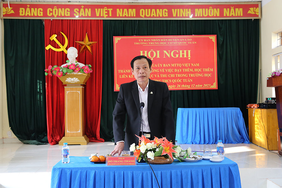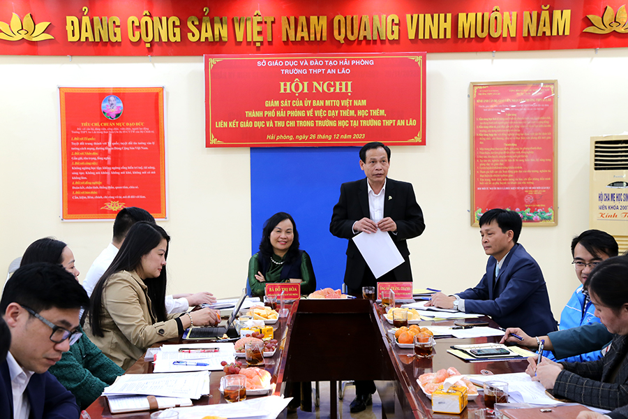 Chiều 26/12, Đoàn giám sát Ủy ban MTTQ Việt Nam thành phố do Phó Chủ tịch Ủy ban MTTQ Việt Nam thành phố Đỗ Tràng Thành làm Trưởng đoàn giám sát việc dạy thêm, học thêm, liên kết giáo dục và thu chi tại Trường THPT An Lão và Trường THCS Quốc Tuấn (huyện An Lão). Tham dự làm việc có đại diện lãnh đạo Sở, ngành và địa phương liên quan.