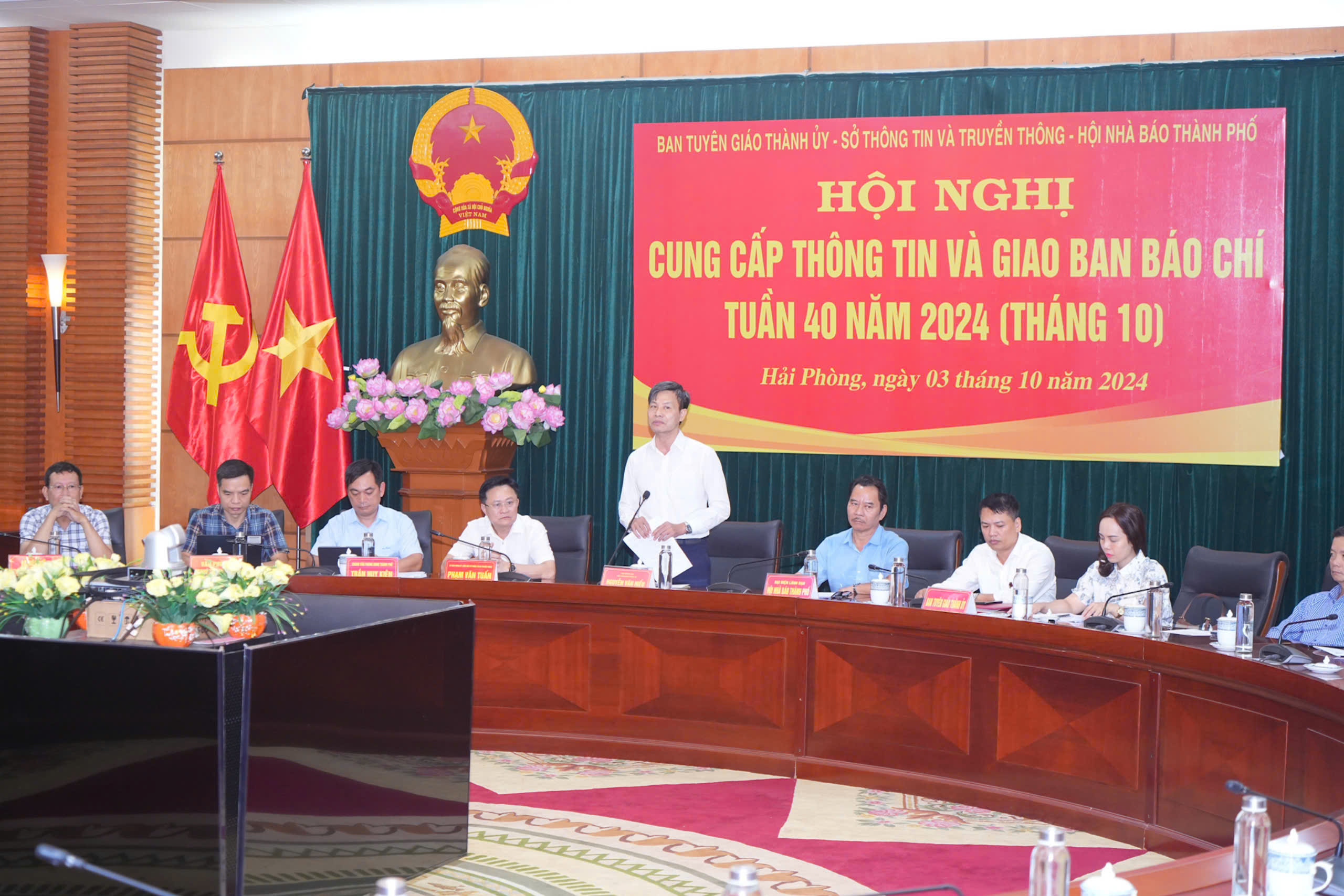 Trao đổi với đại diện các cơ quan báo chí, đồng chí Nguyễn Văn Hiểu Phó Trưởng Ban Tuyên giáo Thành ủy nêu những định hướng tuyên truyền 3 tháng cuối năm 2024, tập trung vào: Kết luận số 96-KL/TW, ngày 30/9/2024 của Bộ Chính trị về tiếp tục thực hiện Nghị quyết 45-NQ/TW của Bộ Chính trị khóa XII về xây dựng và phát triển thành phố Hải Phòng đến năm 2030, tầm nhìn đến năm 2045.