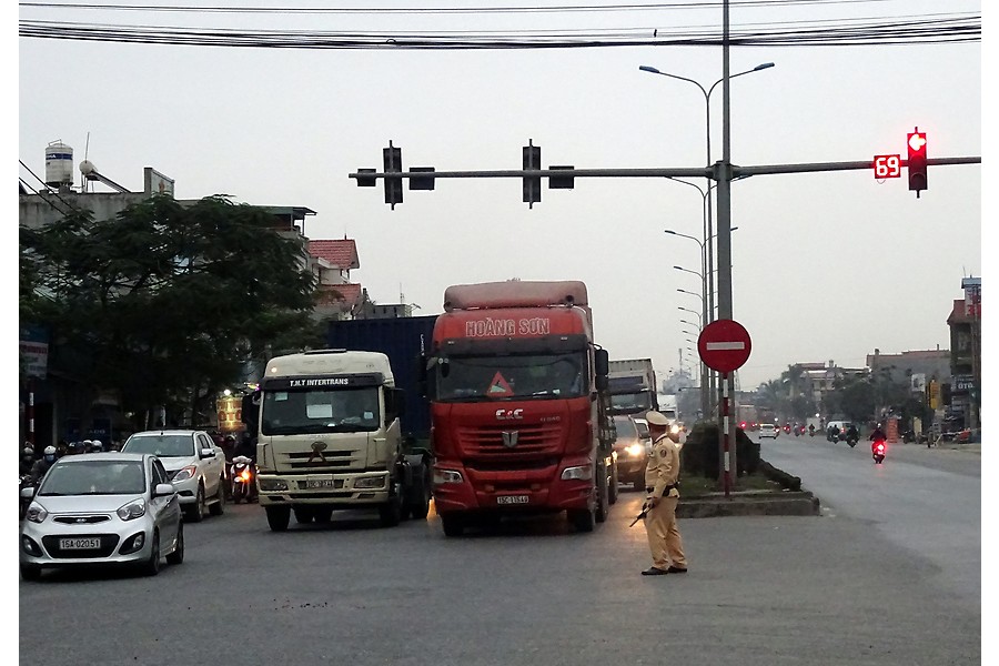 CSGT làm nhiệm vụ điều tiết tại các nút giao trên tuyến đường 356 Đình Vũ.