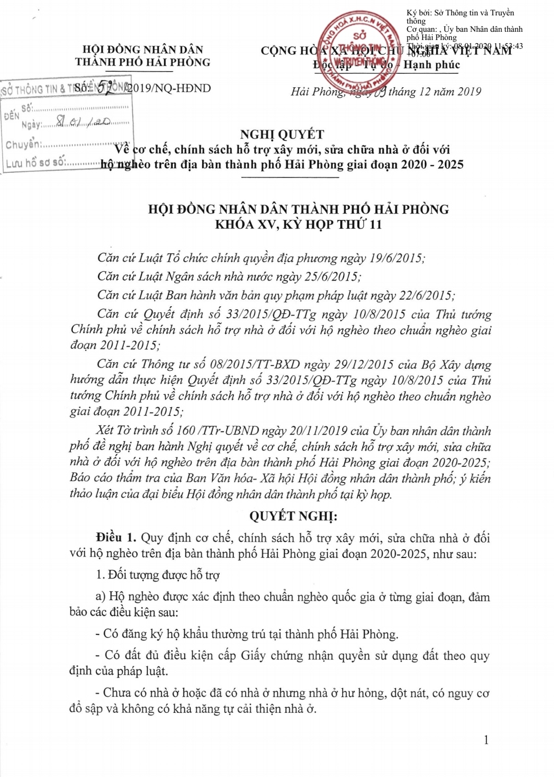 Hội đồng nhân dân thành phố đã ban hành Nghị Quyết số 52/2019/NQ-HĐND ngày 09/12/2019 về cơ chế, chính sách hỗ trợ xây mới, sửa chữa nhà ở đối với hộ nghèo trên địa bàn thành phố Hải Phòng giai đoạn 2020 – 2025.