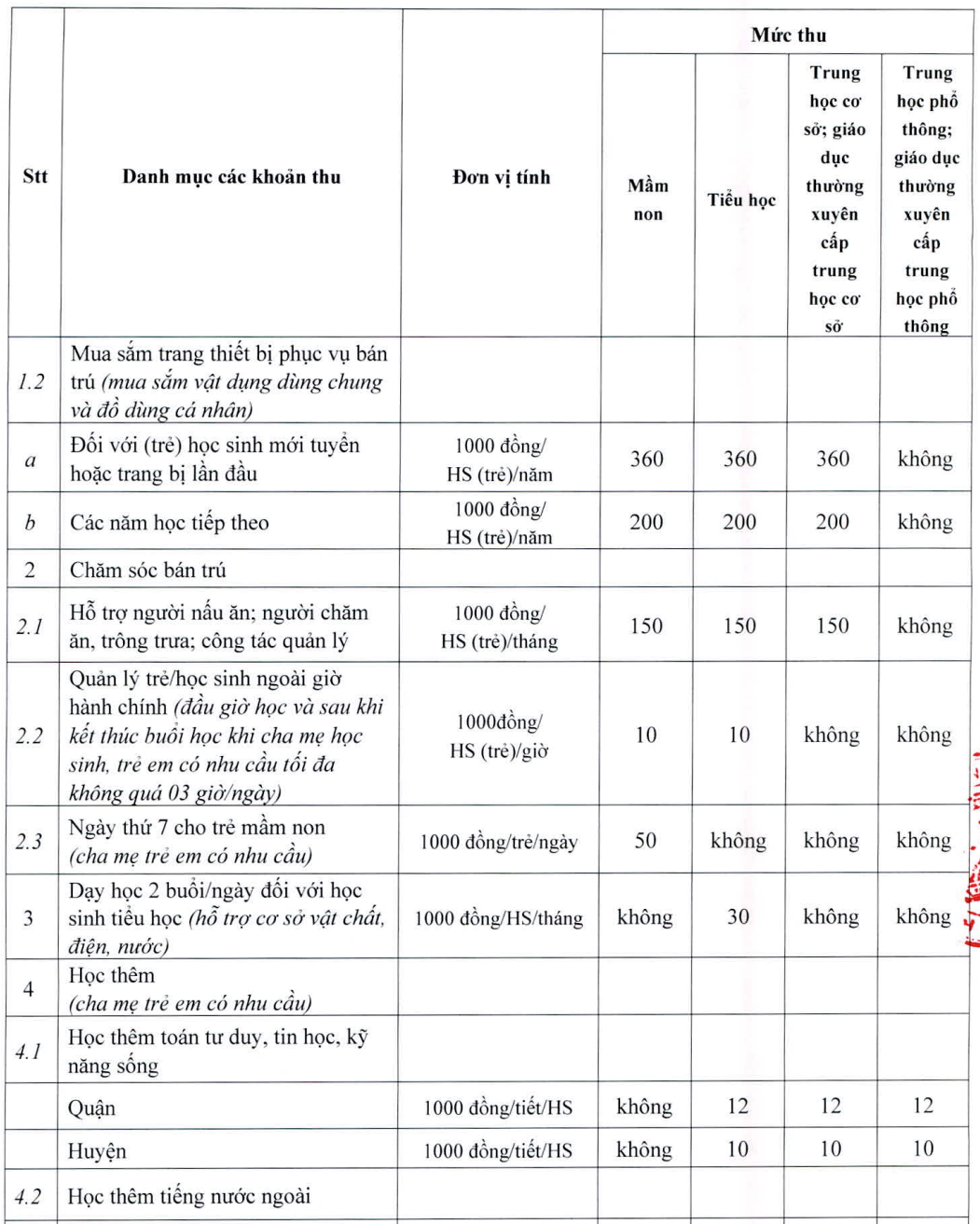 UBND TP.Hải Phòng cũng quy định: Các khoản thu theo kỳ gồm mua sắm trang thiết bị phục vụ bán trú; học và thi nghề phổ thông; nước uống; Các khoản thu theo tháng gồm: tiền ăn; hỗ trợ người nấu ăn, người chăm ăn, trông trưa, công tác quản lý; quản lý trẻ/học sinh ngoài giờ hành chính; ngày thứ 7 cho trẻ mầm non; trông xe; dạy học 2 buổi/ngày đối với học sinh tiểu học; học thêm.