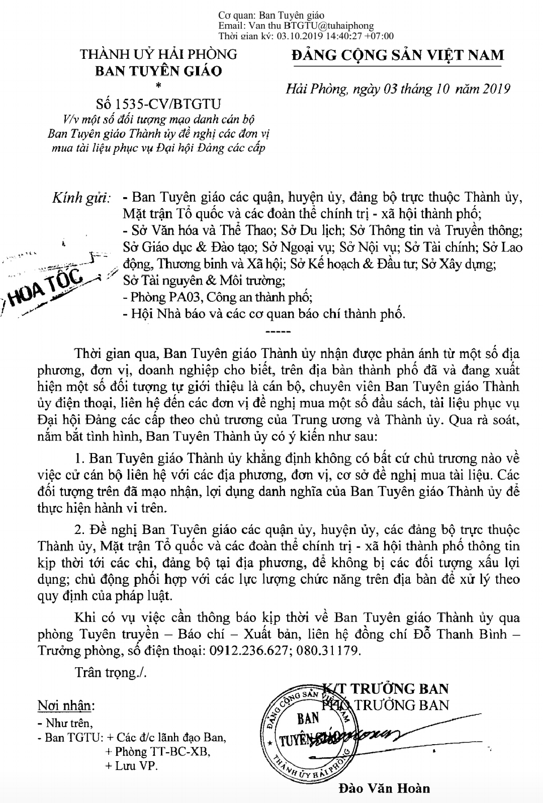 Ban Tuyên giáo Thành ủy Hải Phòng nhận được phản ánh từ một số địa phương, đơn vị, doanh nghiệp về việc trên địa bàn thành phố Hải Phòng đã và đang xuất hiện một số đối tượng tự giới thiệu là cán bộ, chuyên viên Ban Tuyên giáo Thành ủy gọi điện thoại, liên hệ đến các đơn vị đề nghị mua một số đầu sách, tài liệu phục vụ Đại hội Đảng các cấp theo chủ trương của Trung ương và Thành ủy.