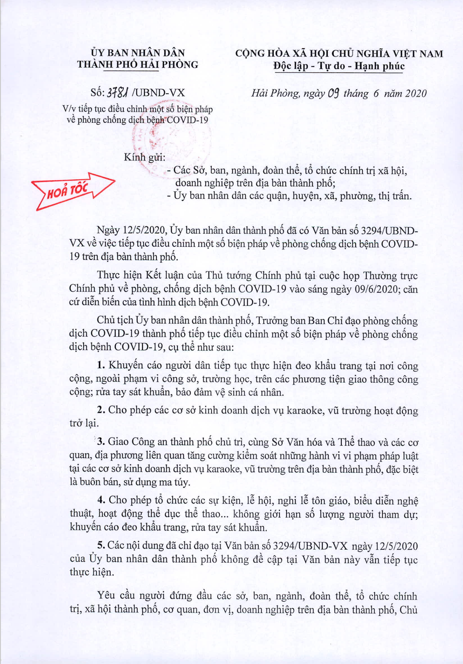 Thực hiện Kết luận của Thủ tướng Chính phủ tại cuộc họp Thường trực Chính phủ về phòng, chống dịch bệnh COVID-19 vào sáng ngày 9/6/2020; căn cứ diễn biến của tình hình dịch bệnh COVID-19, tại Văn bản số 3781/UBND-VX ngày 9/6/2020, Chủ tịch UBND thành phố, Trưởng ban Ban Chỉ đạo phòng chống dịch COVID-19 thành phố tiếp tục điều chỉnh một số biện pháp về phòng chống dịch bệnh COVID-19, cụ thể như sau: