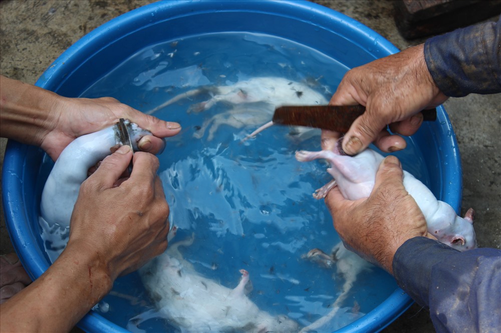 Không chỉ đến các cánh đồng, nhóm săn chuột có kinh nghiệm 40 năm của ông Minh còn quây bắt trên các bờ ao, nơi cỏ mọc rậm rạp. Sau khi tóm gọi một mẻ lớn, cả nhóm cùng mang chuột về nhà sơ chế.