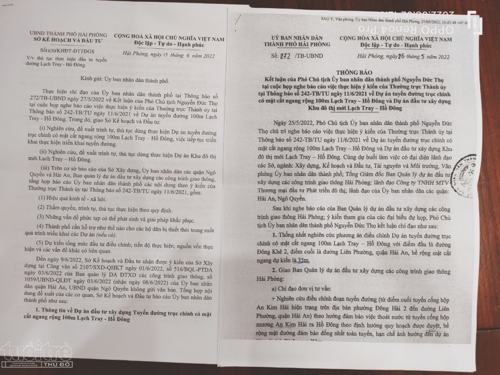 Vì vậy, Thường trực Thành ủy đã có Thông báo số 242-TB/TU ngày 11/6/2021 và UBND TP Hải Phòng có Thông báo số 272/TB-UBND ngày 27/5/2022, giao cho các ngành, trong đó có Sở KH&ĐT nghiên cứu, đề xuất trình tự, thủ tục dừng thực hiện dự án đường Lạch Tray-Hồ Đông và nghiên cứu đề xuất việc tiếp tục triển khai xây dựng tuyến đường có mặt cắt nhỏ hơn (35m).