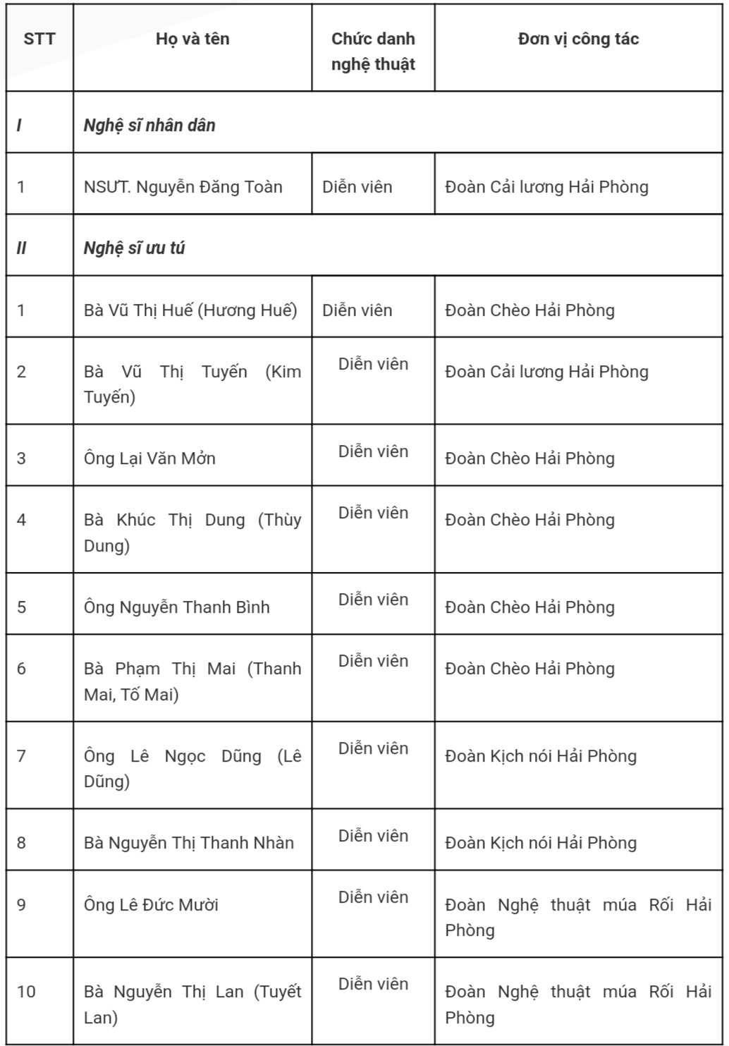 Để ghi nhận các cá nhân có nhiều cống hiến trong sự nghiệp xây dựng và phát triển nền văn hóa của dân tộc, vừa qua, Chủ tịch nước Nguyễn Phú Trọng đã ký các Quyết định truy tặng, phong tặng danh hiệu “Nghệ sĩ nhân dân” và “Nghệ sĩ ưu tú” cho nhiều cá nhân. Trong đó thành phố Hải Phòng vinh dự có thêm 1 nghệ sĩ nhân dân và 10 nghệ sĩ ưu tú, danh sách bao gồm: