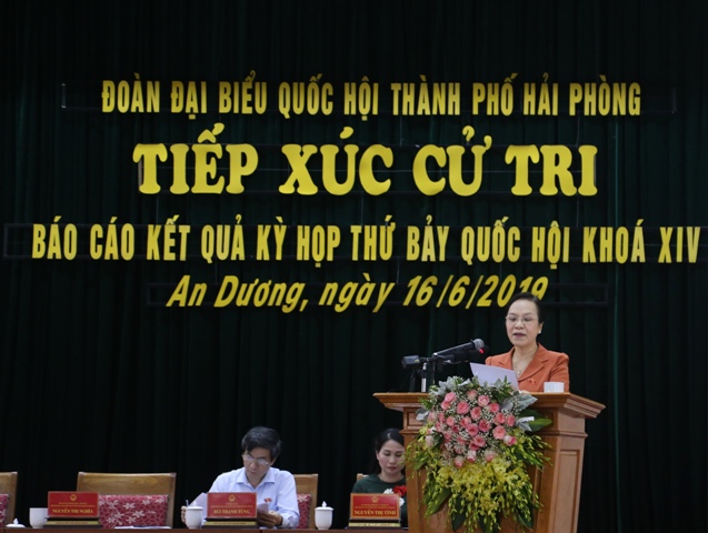 Thay mặt Đoàn đại biểu Quốc hội Hải Phòng báo cáo kết quả Kỳ họp với cử tri, đồng chí Nguyễn Thị Nghĩa, Trưởng đoàn đại biểu Quốc hội Hải Phòng thông tin cho biết, sau 20 ngày làm việc với tinh thần trách nhiệm, dân chủ, trí tuệ (từ ngày 20/5 đến ngày 14/6/2019), Quốc hội đã hoàn thành toàn bộ chương trình kỳ họp. Theo đó, đã xem xét, thông qua 7 luật, 10 nghị quyết, cho ý kiến về 9 dự án luật; giám sát tối cao chuyên đề “Việc thực hiện chính sách, pháp luật về quy hoạch, quản lý, sử dụng đất đai tại đô thị từ khi Luật Đất đai năm 2013 có hiệu lực đến hết năm 2018”; tiến hành chất vấn và trả lời chất vấn đối với 4 nhóm vấn đề liên quan đến các lĩnh vực giao thông vận tải, xây dựng, an ninh trật tự, an toàn xã hội, văn hóa, thể thao và du lịch; xem xét các báo cáo về kinh tế – xã hội, ngân sách nhà nước và nhiều báo cáo quan trọng khác; phê chuẩn nhân sự.