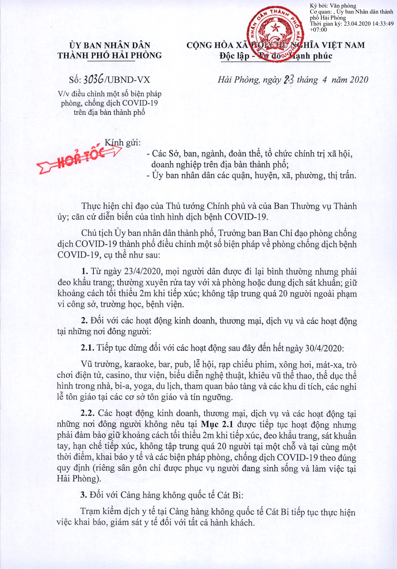 2.2. Các hoạt động kinh doanh, thương mại, dịch vụ và các hoạt động tại những nơi đông người không nêu tại Mục 2.1 được tiếp tục hoạt động nhưng phải đảm bảo giữ khoảng cách tối thiểu 2m khi tiếp xúc, đeo khẩu trang, sát khuẩn tay, hạn chế tiếp xúc, không tập trung quá 20 người tại một chỗ và tại cùng một thời điểm, khai báo y tế và các biện pháp phòng, chống dịch COVID-19 theo đúng quy định (riêng sân gôn chỉ được phục vụ người đang sinh sống và làm việc tại Hải Phòng).