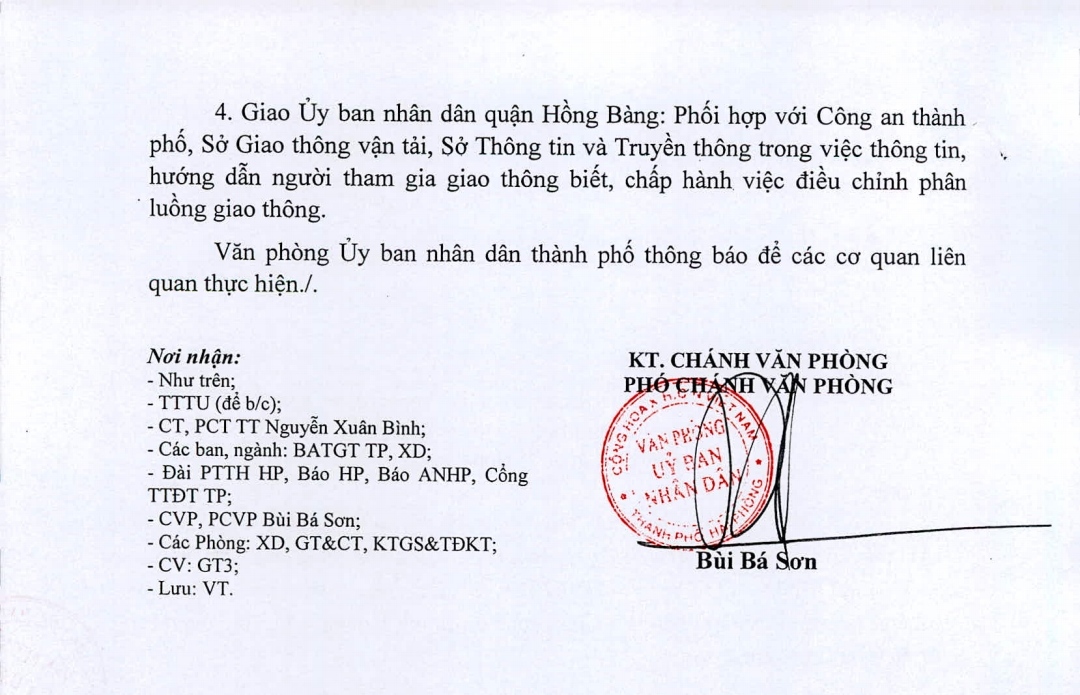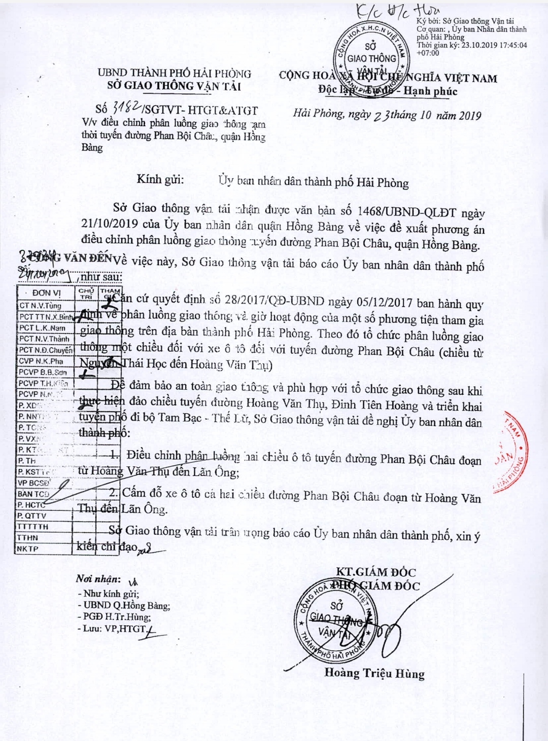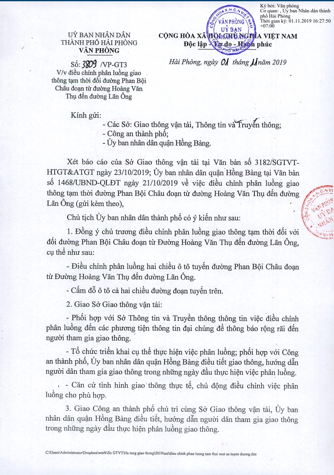 UBND thành phố có văn bản số 3809/VP-GT3 ngày 01/11/2019 về việc điều chỉnh phân luồng giao thông tạm thời đối với đường Phan Bội Châu đoạn từ đường Hoàng Văn Thụ đến đường Lãn Ông.