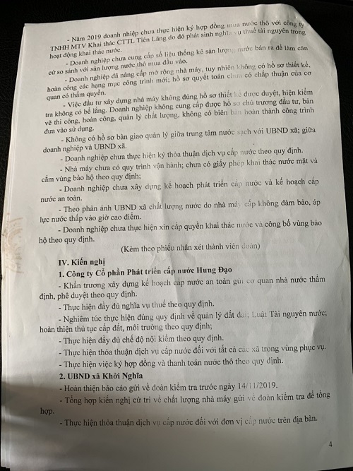 Từ năm 2019, Công ty Hưng Đạo không còn ký hợp đồng nhưng họ vẫn sử dụng nguồn nước thô của Công ty Thủy lợi Tiên Lãng quản lý. Công ty nhiều lần liên lạc, gọi điện thoại thậm chí là gửi văn bản nhưng bên Công ty Hưng Đạo không hề có phản hồi hay phúc đáp nào.