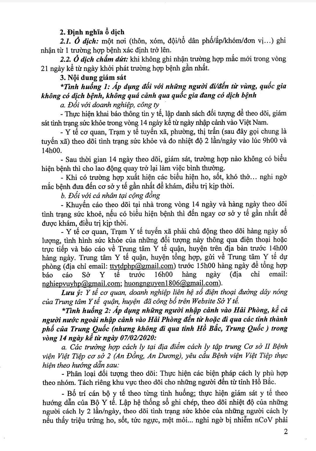Theo hướng dẫn của Bộ Y tế tại Quyết định số 18/QĐ-BYT ngày 21/01/2020 v/v hướng dẫn tạm thời giám sát và phòng, chống bệnh viêm đường hô hấp cấp do chủng mới của vi rút Corona, Ban Chỉ đạo Anti-nCoV Hải Phòng hướng dẫn về 03 nội dung chính, bao gồm: Định nghĩa trường hợp bệnh và người tiếp xúc gần; Định nghĩa ổ dịch; Nội dung giám sát đối với 03 tình huống.