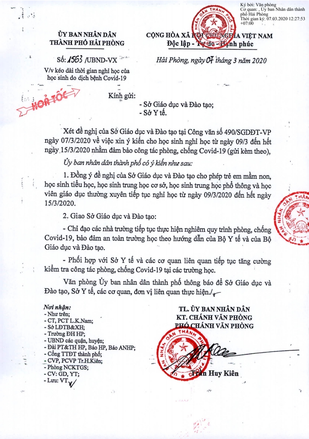 Ủy ban nhân dân thành phố vừa có văn bản số 1563/UBND-VX ngày 7/3/2020, theo đó, đồng ý với đề xuất của Sở GD&ĐT cho phép trẻ em mầm non, học sinh tiểu học, học sinh THCS, học sinh THPT và học viên giáo dục thường xuyên tiếp tục nghỉ học từ ngày 9/3/2020 đến hết ngày 15/3/2020.