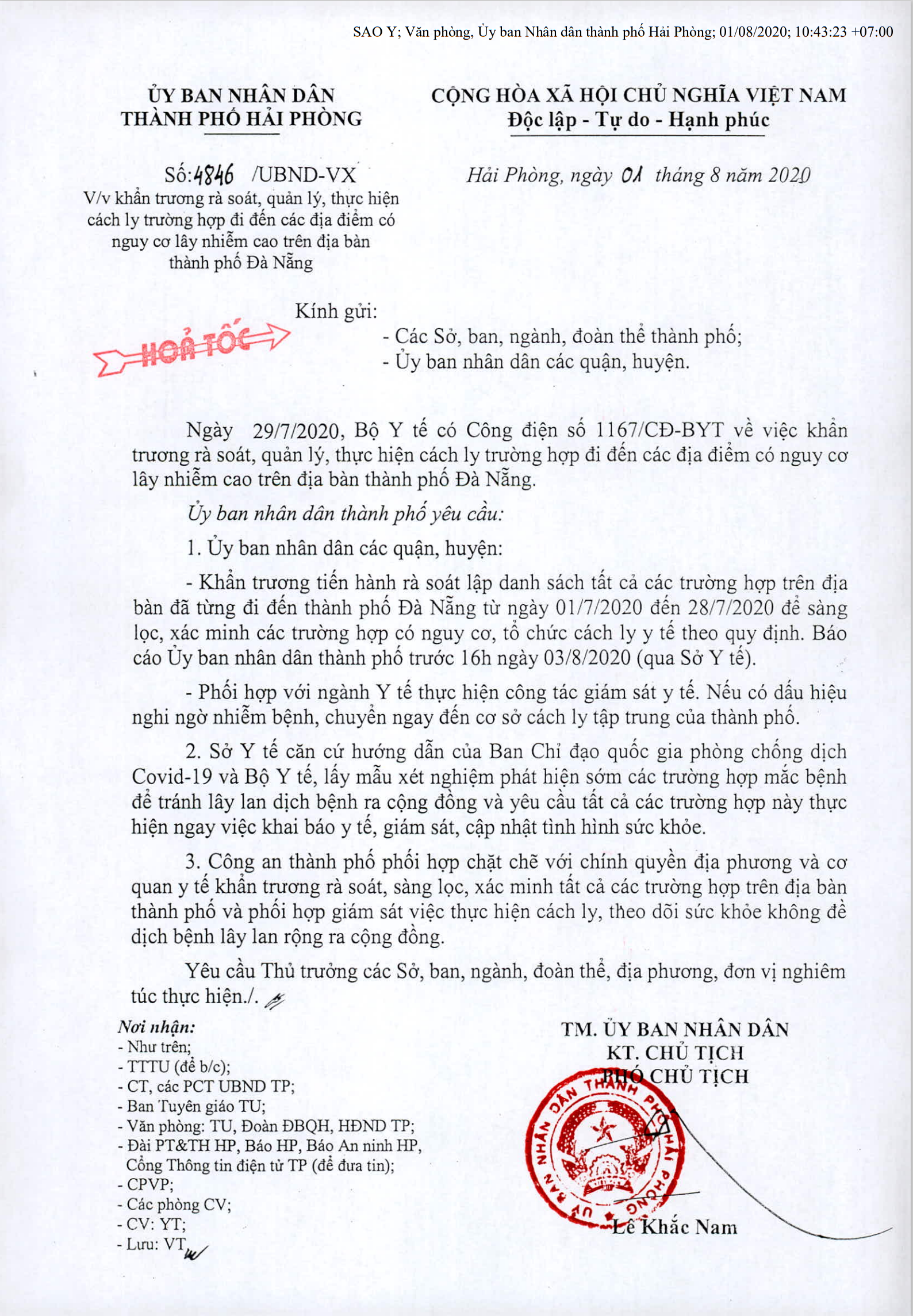 Sáng 01/8/2020, Ủy ban nhân dân thành phố ban hành văn bản số 4846/UBND-VX về việc khẩn trương rà soát, quản lý, thực hiện cách ly trường hợp đi, đến địa điểm có nguy cơ lây nhiễm cao trên địa bàn thành phố Đà Nẵng.