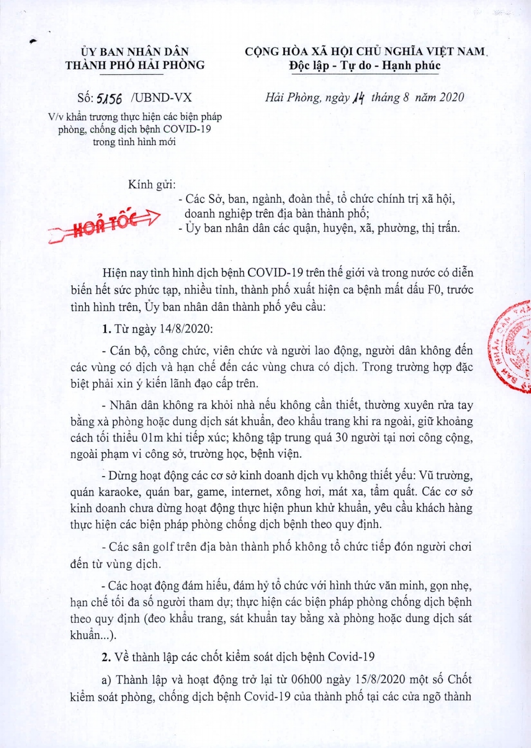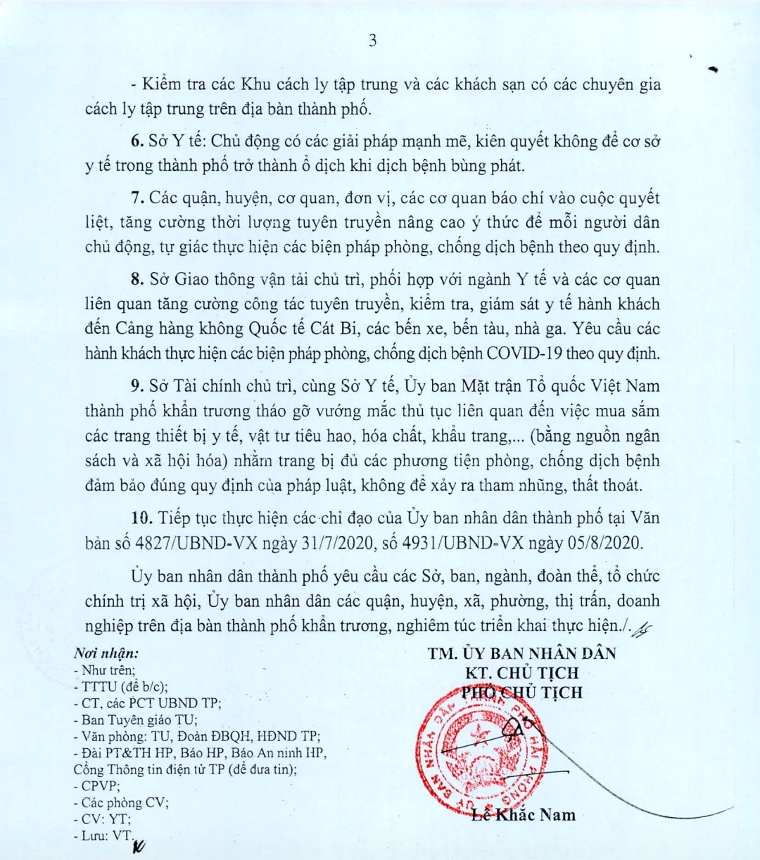 Ngày 14/8/2020, Ủy ban nhân dân thành phố đã có văn bản số 5156/UBND-VX về việc khẩn trương thực hiện các biện pháp phòng, chống dịch Covid-19 trong tình hình mới.