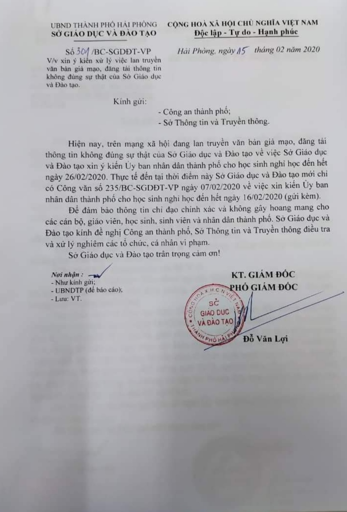 Trước tình hình văn bản giả đang lan truyền chóng mặt trên mạng xã hội, gây hoang mang cho giáo viên, học sinh và phụ huynh, sáng 15/2/2020, Sở Giáo dục và đào tạo Hải Phòng đã có văn bản báo cáo UBND thành phố; đề nghị Công an thành phố, Sở Thông tin và Truyền thông điều tra và xử lý nghiêm các tổ chức, cá nhân vi phạm.