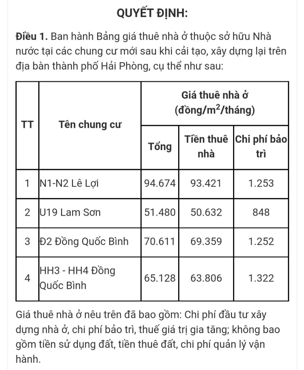 Cụ thể, theo Quyết định trên, giá thuê tại các chung cư mới sau khi cải tạo, xây dựng lại trên địa bàn TP Hải Phòng được áp dụng như sau: Tại chung cư N1-N2 Lê Lợi có tổng giá thuê nhà ở là 94.674 đồng/m²/tháng (trong đó bao gồm tiền thuê nhà là 93.421 đồng và 1.253 đồng chi phí bảo trì); Chung cư U19 Lam Sơn có tổng giá thuê là 51.480 đồng/m²/tháng; Chung cư Đ2 Đồng Quốc Bình có tổng giá thuê là 70.611 đồng/m²/tháng; khu HH3-HH4 Đồng Quốc Bình có tổng giá thuê là 65.128 đồng/m²/tháng.