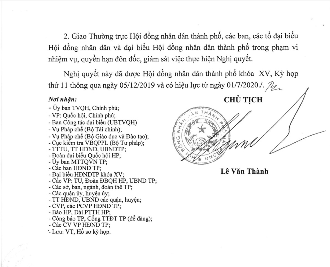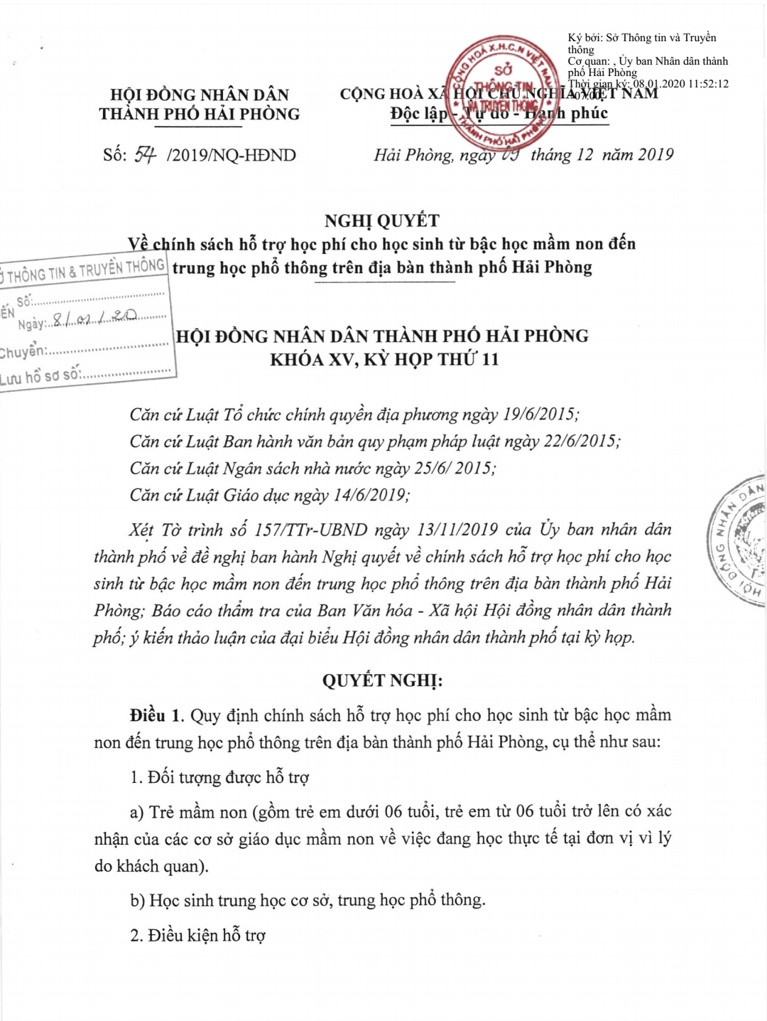 Hội đồng nhân dân thành phố Hải Phòng, xét đề nghị của Ủy ban nhân dân thành phố tại Tờ trình số 157/TTr-UBND ngày 13/11/2019, đã ban hành Nghị Quyết số 54/2019/NQ-HĐND về chính sách hỗ trợ học phí cho học sinh từ bậc học mầm non đến trung học phổ thông trên địa bàn thành phố Hải Phòng.