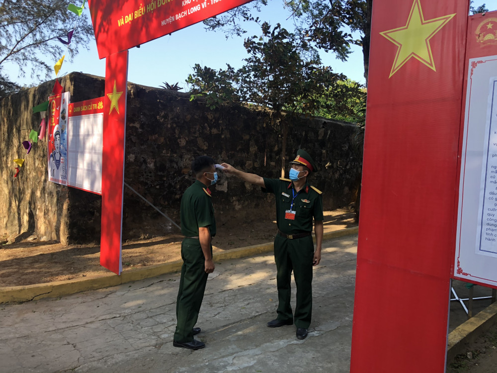 Cán bộ, chiến sĩ Tiểu đoàn phòng thủ đảo (Bộ CHQS thành phố Hải Phòng) thực hiện nghiêm công tác phòng chống dịch COVID-19 trong ngày bầu cử sớm. Ảnh: Văn Minh