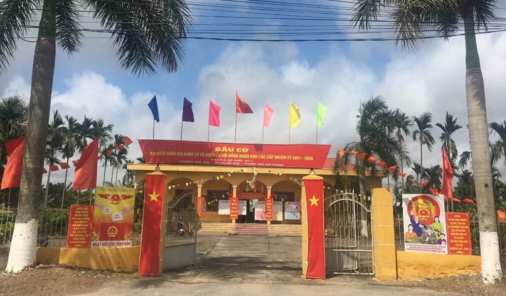 Một điểm bầu cử trên địa bàn quận Đồ Sơn. Tại khu vực bỏ phiếu đã hoàn thành việc trang trí khánh tiết trong và ngoài hội trường nơi tổ chức bỏ phiếu đảm bảo trang nghiêm theo quy định.