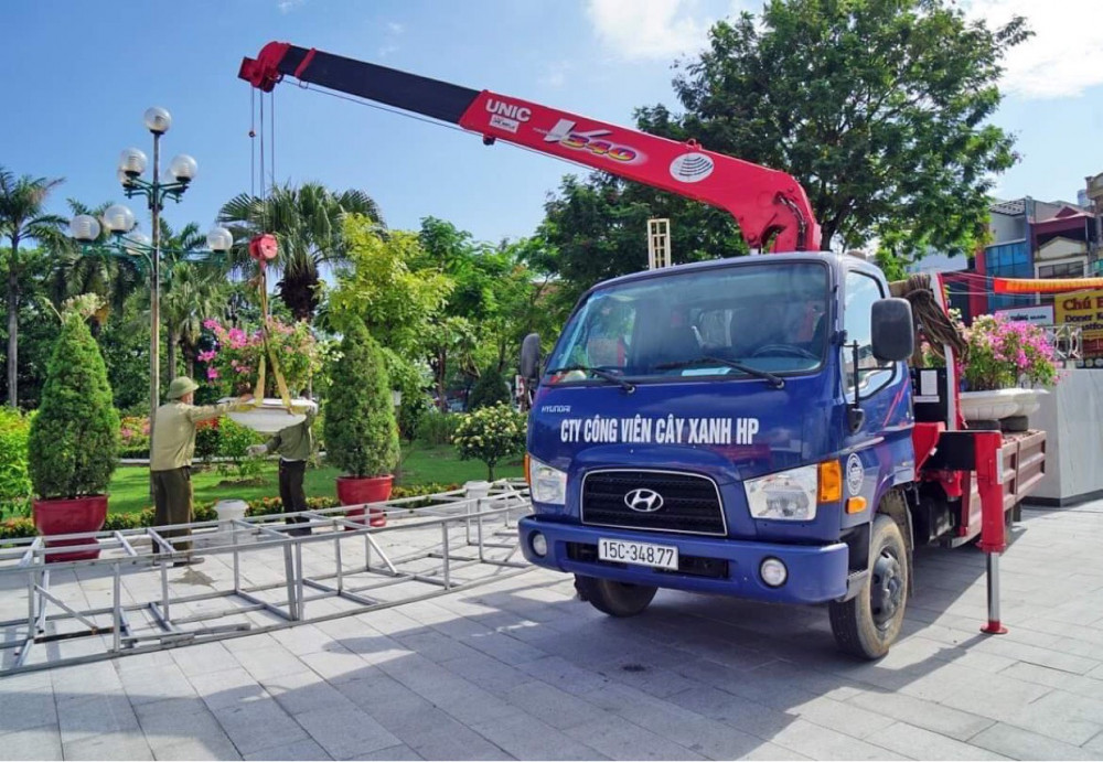 Nhân viên Công ty Công viên cây xanh Hải Phòng bổ sung thêm các chậu hoa tại các công viên. Ảnh: Vũ Dũng