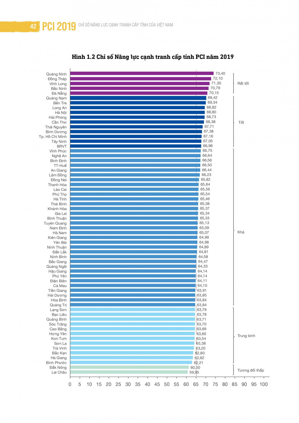 Các tỉnh, thành phố tiếp theo trong nhóm 10 tỉnh, thành phố đứng đầu PCI 2019 bao gồm Đà Nẵng (70,15 điểm), Quảng Nam (69,42 điểm), Bến Tre (69,34 điểm), Long An (68,82 điểm), Hà Nội (68,80 điểm) và Hải Phòng (68,73 điểm).