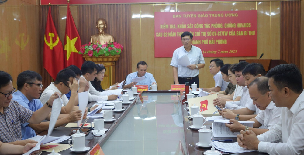 Sáng 14/7, Ban Tuyên giáo Thành ủy làm việc với Đoàn kiểm tra của Ban Tuyên giáo Trung ương về công tác phòng, chống HIV/AIDS sau 02 năm thực hiện Chỉ thị số 07 của Ban Bí thư về tăng cường sự lãnh đạo công tác phòng, chống HIV/AIDS, tiến tới chấm dứt dịch bệnh AIDS tại Việt Nam trước năm 2030. Đoàn công tác do đồng chí Bùi Ngọc Quý, Vụ trưởng Vụ các vấn đề xã hội (Ban Tuyên giáo Trung ương) làm Trưởng đoàn.