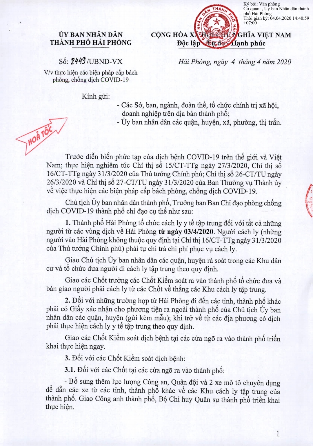 1. Thành phố Hải Phòng tổ chức cách ly y tế tập trung đối với tất cả những người từ các vùng dịch về Hải Phòng từ ngày 03/4/2020. Người cách ly (những người vào Hải Phòng không thuộc diện quy định tại Chỉ thị số 16/CT-TTg ngày 31/3/2020 của Thủ tướng Chính phủ) phải tự chi trả chi phí phục vụ cách ly.